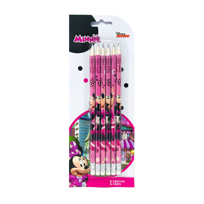 Conjunto de 6 lápis de carvão com borracha no topo da Minnie da Disney.