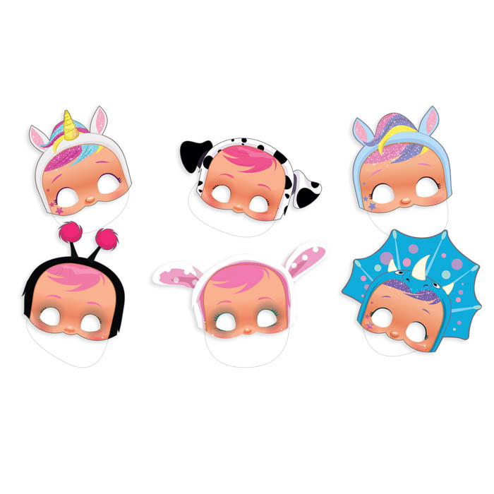 Conjunto de 6 máscaras de cartão com elástico, com as formas dos personagens dos Cry Babies, ideal para a tua festinha.