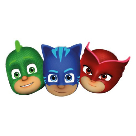 Conjunto de 6 máscaras de cartão com elástico, dos PJ Masks, ideal para a tua festinha com o mesmo tema.