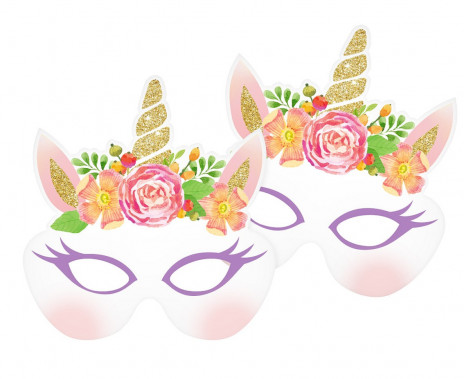 Máscaras de cartão com elástico de unicórnio para as tuas festas de aniversário do mesmo tema.