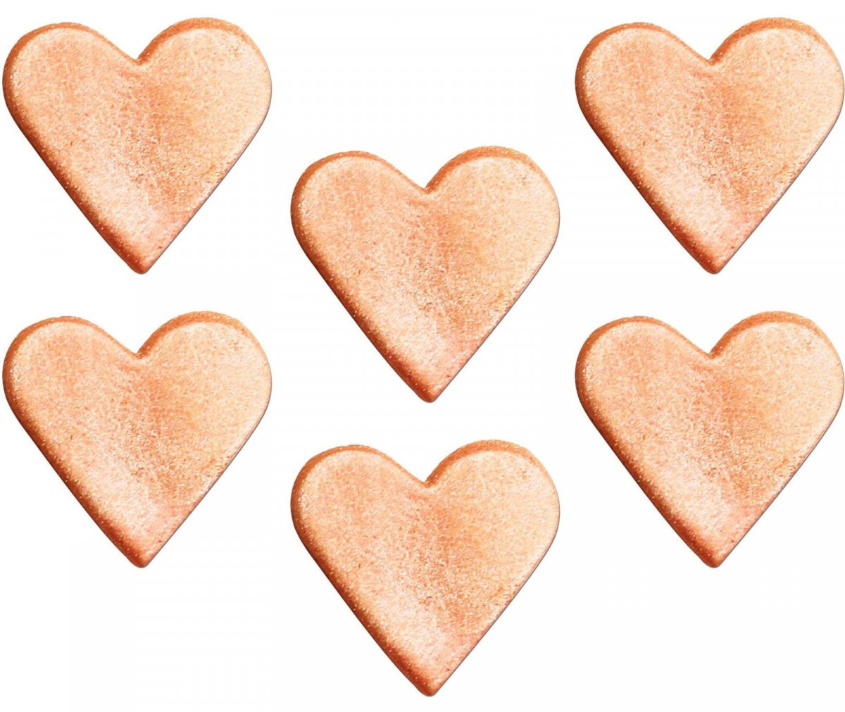 Pack de 6 toppers artesanais feitos em açúcar para decoração de bolos, com motivo de corações dourados.