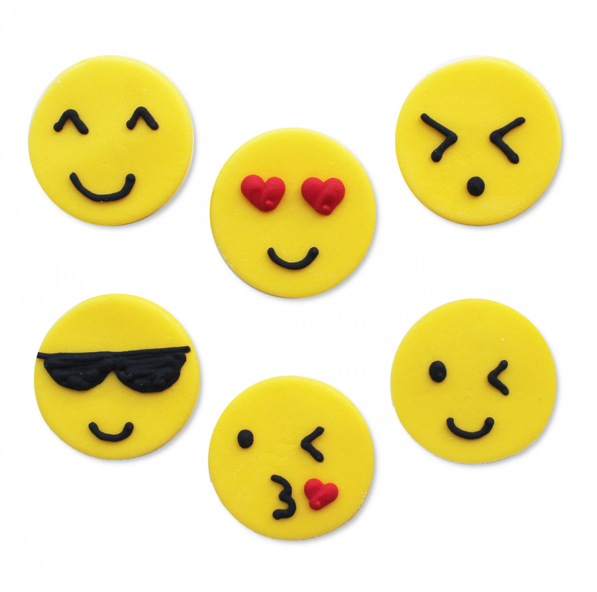 Discos comestiveis de açúcar para utilizar como topper em cupcakes ou decorar bolos de aniversário com vários Emojis.