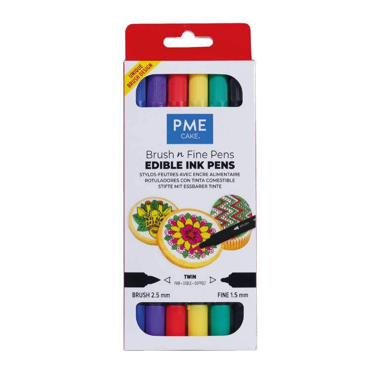 Conjunto de 6 marcadores de tinta comestivel, perfeito para criar detalhes delicados e mensagens em pasta de açúcar, fondant, pasta de goma, papel açucarado, papel de arroz e muito mais.