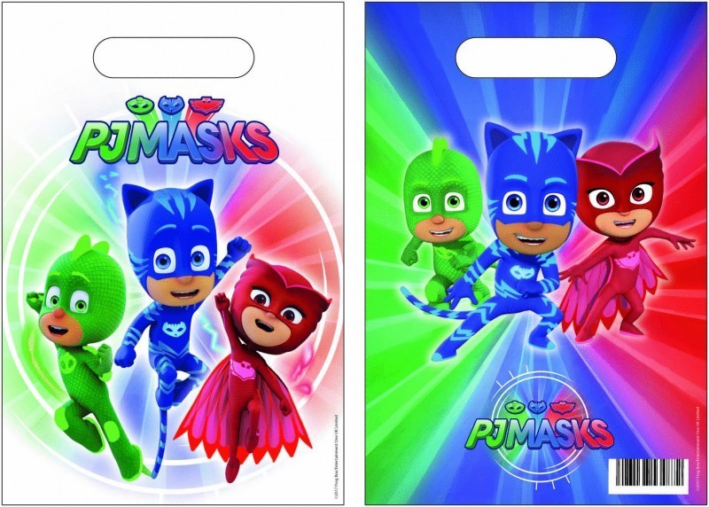 Pack de 6 sacos para colocar os brindes a dar aos amigos nas festas de aniversário dos PJMasks. As imagens correspondem ao frente e verso de cada saco.