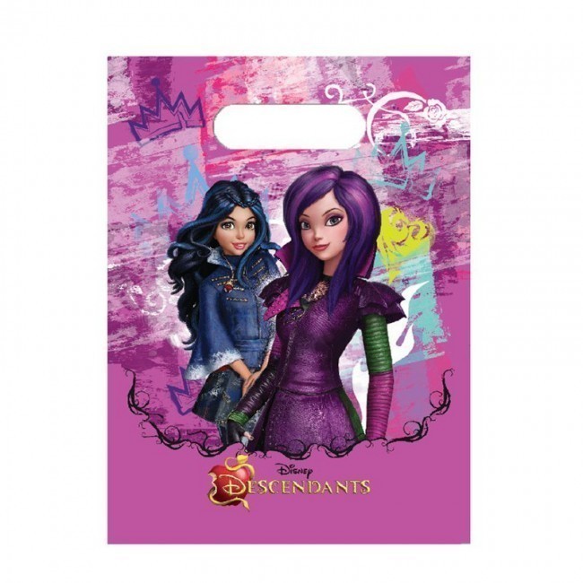 Conjunto de 6 sacos com pega em plástico para brinde de aniversário Disney Descendants.Dimensões: 23 x 16,5 cm.
