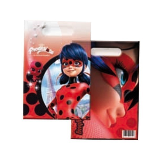 Conjunto de 6 saquinhos com asa da Miraculous Ladybug ótimos para ofertares brindes ou guloseimas aos convidados da tua festa de aniversário.Dimensão: 17x25cm.