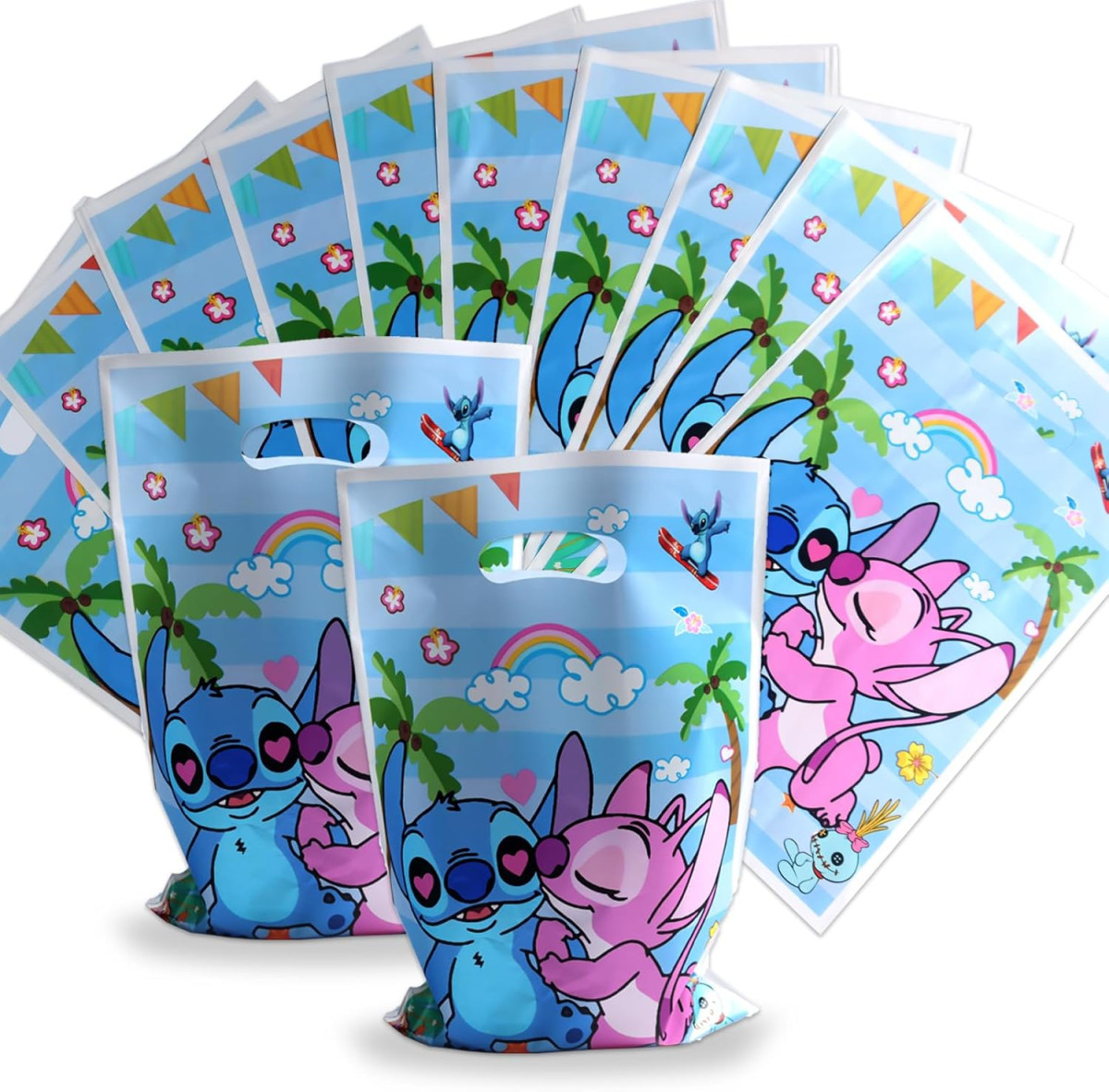 Conjunto de 6 sacos brinde em plástico do Stitch e da Angel da Disney, ideal para colocar brindes ou doces na sua festa de aniversário com o mesmo tema.