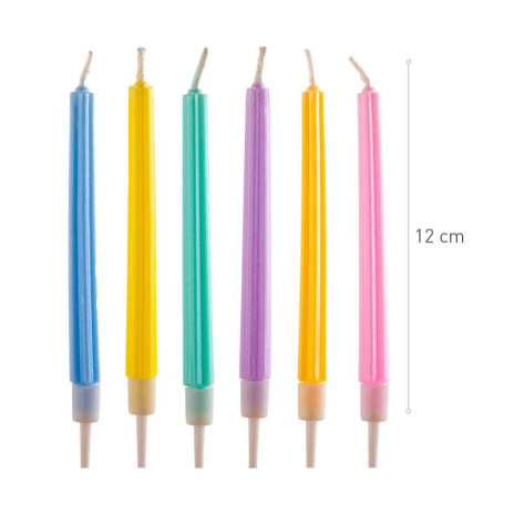 Conjunto de 6 velas super coloridas, ideais para qualquer bolo de aniversário.