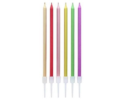 Conjunto de 6 velas altas para bolos de aniversário com muito glamour com várias cores metálicas.