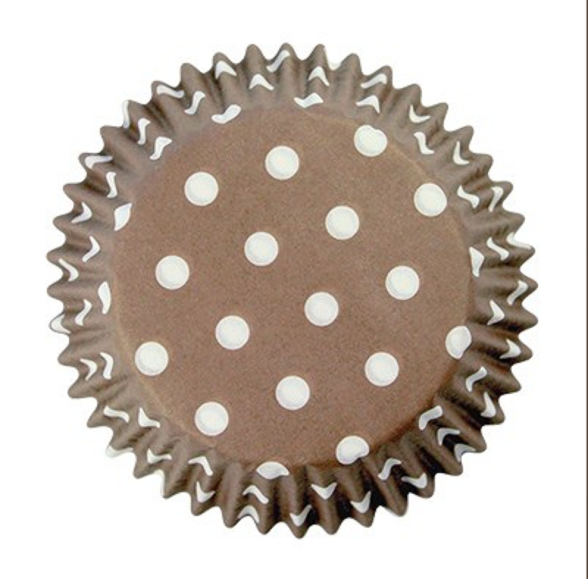 Cápsulas perfeitas para muffins, cupcakes, brownies e muito mais, para qualquer tipo de festa e/ou evento na cor castanha com bolinhas brancas.