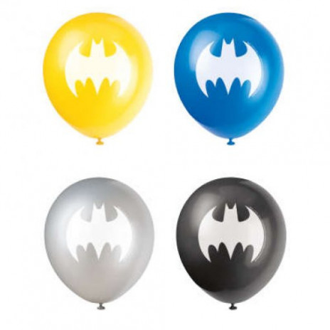 Conjunto de 8 balões latex com 4 cores sortidas (preta, amarela, azul e cinza) do Batman da DC Comics para a tua festa de aniversário.