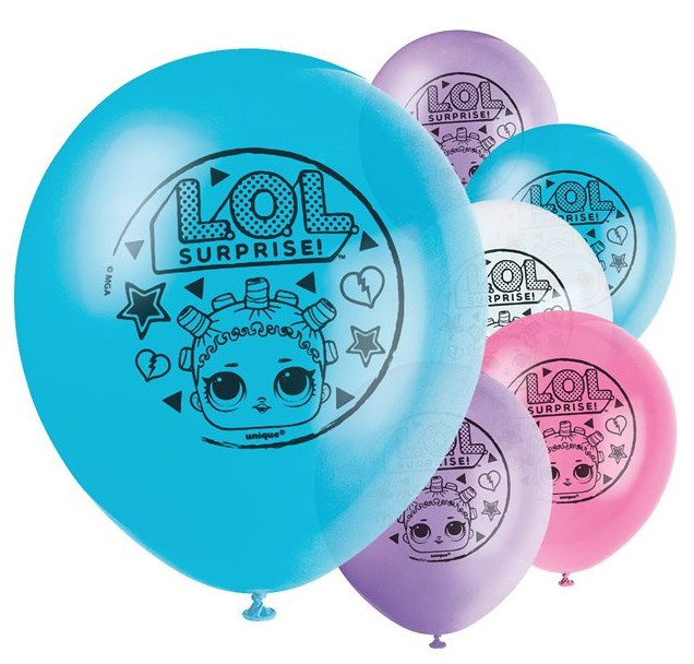Conjunto de 8 balões latex com 4 cores sortidas (rosa, roxo, branco e azul) das LOL Surprise para a tua festa de aniversário.