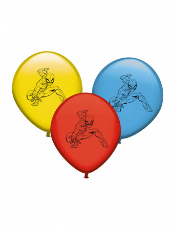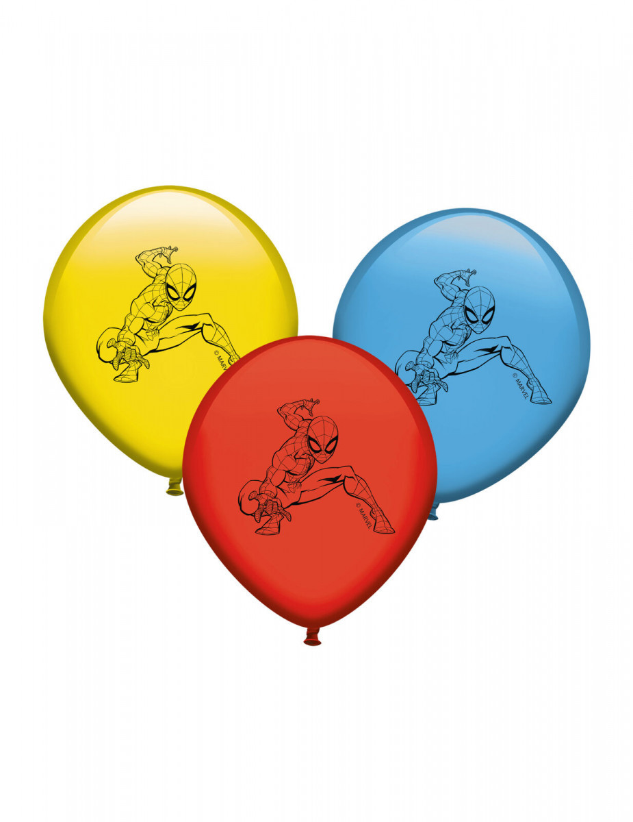 Pack de 8 balões em latéx do Homem Aranha em azul, amarelo e vermelho.