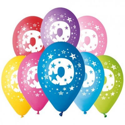 Conjunto de 8 balões de cores sortidas em látex, com a impressão do nº 0 (número zero) para festas de aniversário e outros eventos. Qualidade premium e aptos para enchimento com hélio.
