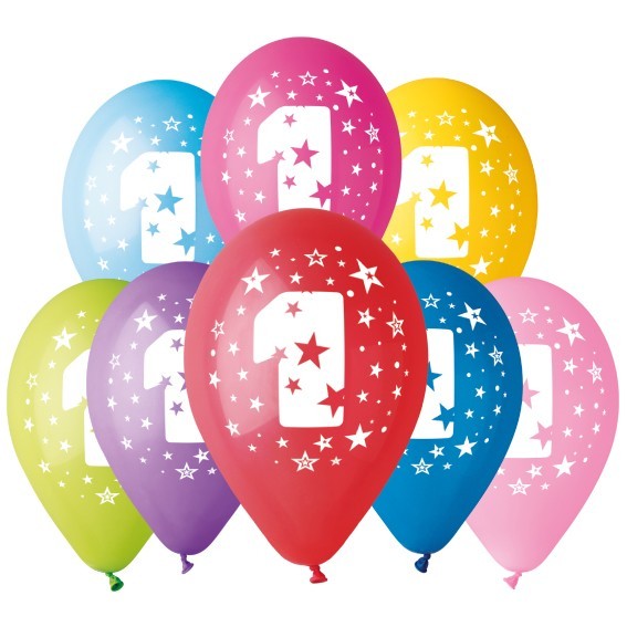 Conjunto de 8 balões de cores sortidas em látex, com a impressão do nº 1 (número um) para festas de aniversário e outros eventos. Qualidade premium e aptos para enchimento com hélio.