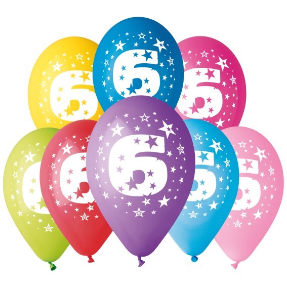 Conjunto de 8 balões de cores sortidas em látex, com a impressão do nº 6 (numero seis) para festas de aniversário e outros eventos. Qualidade premium e aptos para enchimento com hélio.