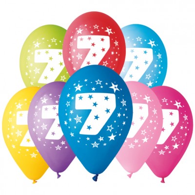 Conjunto de 8 balões de cores sortidas em látex, com a impressão do nº 7 (número sete) para festas de aniversário e outros eventos. Qualidade premium e aptos para enchimento com hélio.