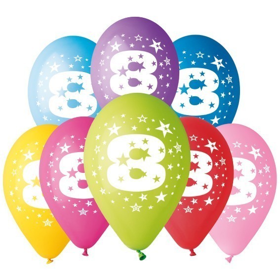 Conjunto de 8 balões de cores sortidas em látex, com a impressão do nº 8 (número oito) para festas de aniversário e outros eventos. Qualidade premium e aptos para enchimento com hélio.