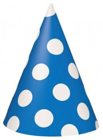 Conjunto de 8 chapéus cone em cartão com elástico em azul com bolinhas brancas, para decoração de qualquer festa ou evento.