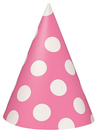 Conjunto de 8 chapéus cone em cartão com elástico em cor de rosa com bolinhas brancas, para decoração de qualquer festa ou evento.