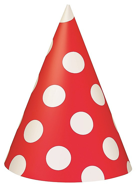 Conjunto de 8 chapéus cone em cartão com elástico em vermelho com bolinhas brancas, para decoração de qualquer festa ou evento.