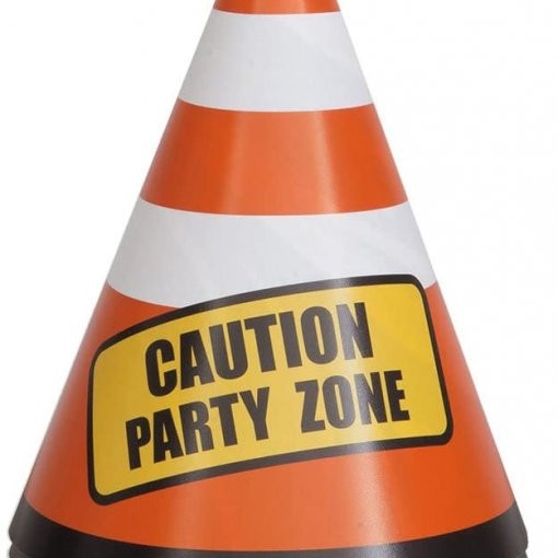 Conjunto de 8 chapéus cone em cartão com elástico para a tua festa de aniversário com o tema de construção, com a impressão de cones de sinalização.