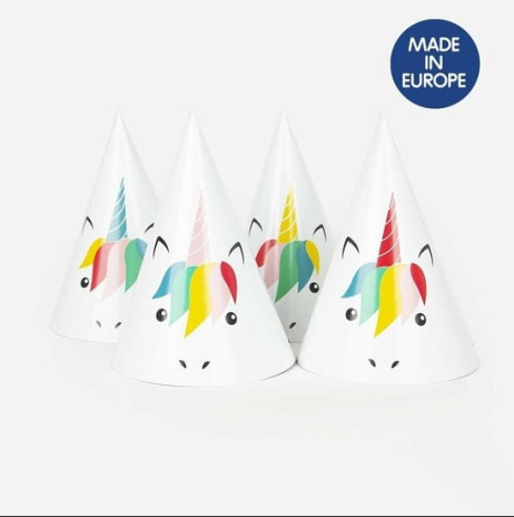 Conjunto de 8 chapéus cone em cartão para a tua festa de aniversário com o tema de unicórnios, coleção mini unicórnio.