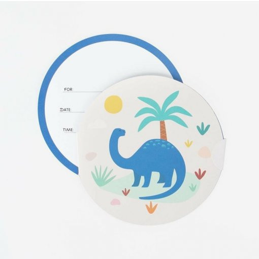 Pack de 8 convites para festas de aniversário com o tema de dinossauros. Com local para escrever o nome, data e hora.
