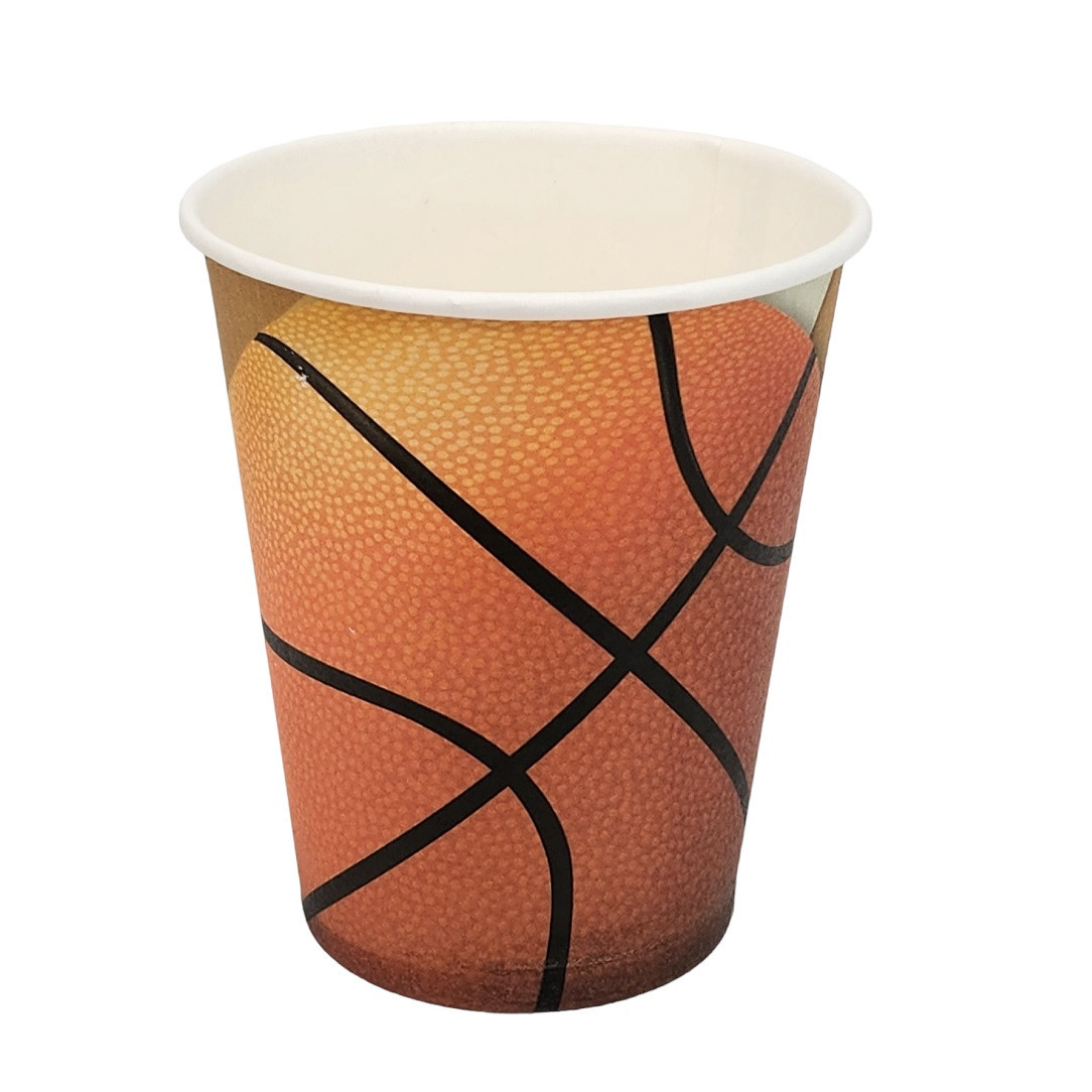 Pack de 8 copos descartáveis de papel com o tema basquetebol e capacidade de 266ml.