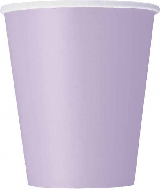 Copos de papel na cor lavanda para festas de aniversário e outros eventos.