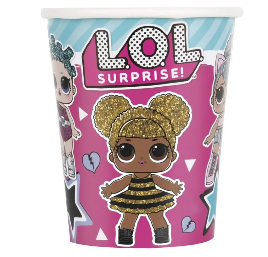 Conjunto de 8 copos de papel biodegradável das LOL Surprise com capacidade para 270ml, ideal para a tua festa de aniversário com o mesmo tema.