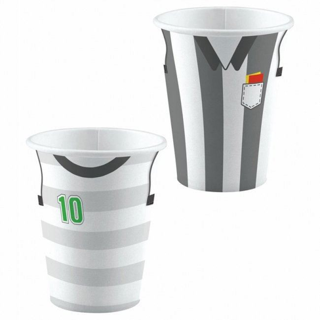 Conjunto de 8 copos papel de futebol, o complemento ideal para tua mesa de aniversário, mesa divertida onde tens árbitros e jogadores.