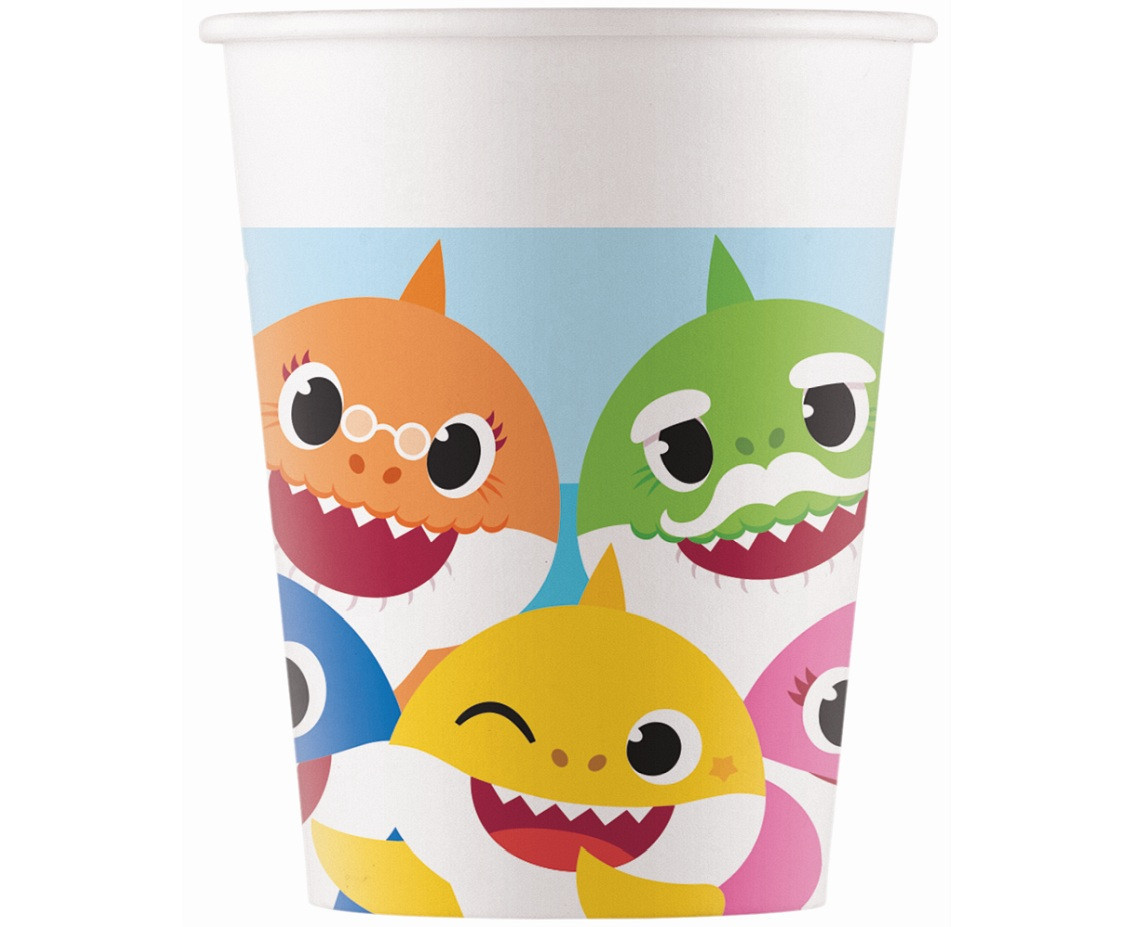Conjunto de 8 copos de papel do Baby Shark, ideal para a tua festa de aniversário.
