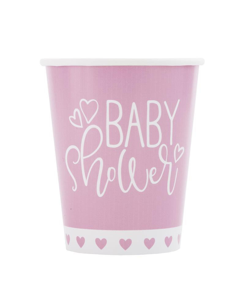 Conjunto de 8 copos de papel para chá de bebé em tons de rosa. Ideal para a festinha de boas vindas da sua bebé.