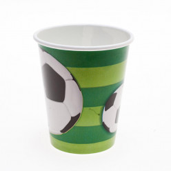 Conjunto de 8 copos de papel descartáveis com decoração de relvado e bola de futebol.
