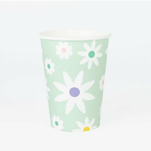 Conjunto de 8 copos papel com o tema de margaridas. O complemento ideal para tua mesa de aniversário com o mesmo tema.
