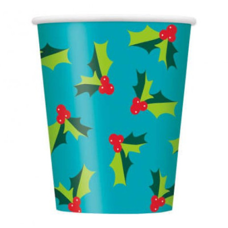 Conjunto de 8 copos papel descartáveis para decoração da sua mesa de natal, com azevinho.