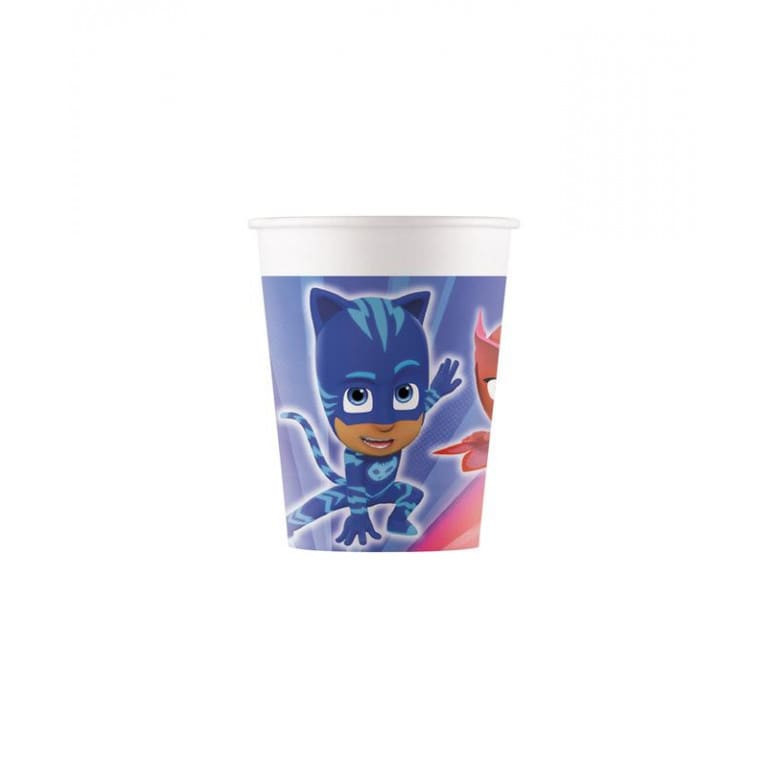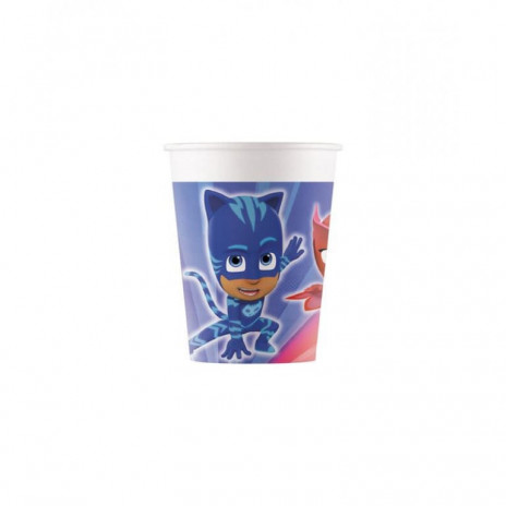 Conjunto de 8 copos de papel dos Pj Masks com capacidade para 200ml, ideal para a tua festa de aniversário. Feitos em papel, amigos do ambiente.