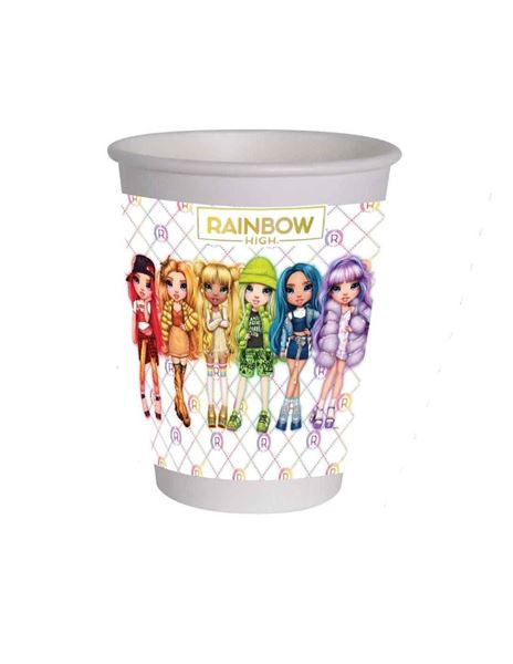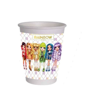 Conjunto de 8 copos de papel das Rainbow High, ideal para a tua festa de aniversário com o mesmo tema.
