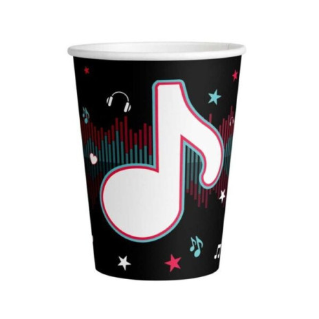 Conjunto de 8 copos de papel com nota musical do Tik Tok, ideal para a tua festa de aniversário com o mesmo tema.