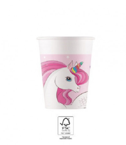 Conjunto de 8 copos de papel de unicórnio com capacidade para 200ml, ideal para a tua festa de aniversário com o mesmo tema.