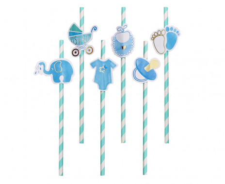 Conjunto de 8 palhinhas de papel para decoração de baby shower, chá de revelação em tons de azul.