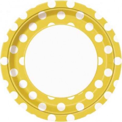 Pack de 8 pratos descartáveis na cor Amarelo claro com bolinhas brancas