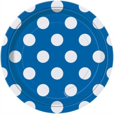 Pack de 8 pratos descartáveis na cor Azul Royal com bolinhas brancas