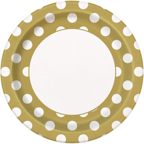 Pack de 8 pratos descartáveis na cor dourada com bolinhas brancas para todo o tipo de festas.