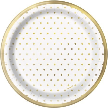 Pack de 8 pratos descartáveis na com bolinhas Douradas e fundo branco