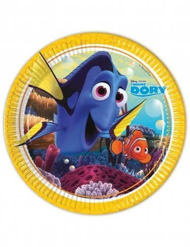 Pratos em cartão resistente decorados com as personagens do filme À procura de Dory.