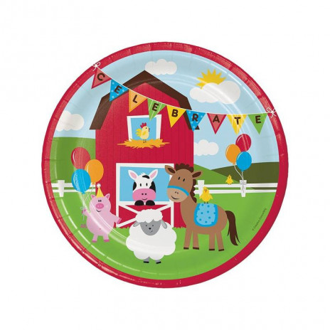 Conjunto de 8 pratos de papel descartáveis dos animais da quinta para decorar a tua festa de aniversário com o mesmo tema.