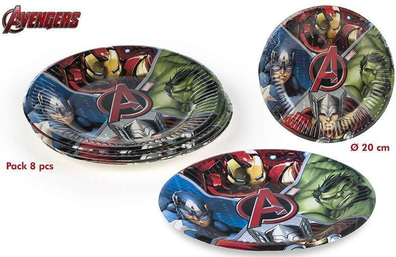 Conjunto de 8 pratos dos Vingadores da Marvel, ideal para decorar a tua festa de aniversário. Com 20cm de diâmetro.