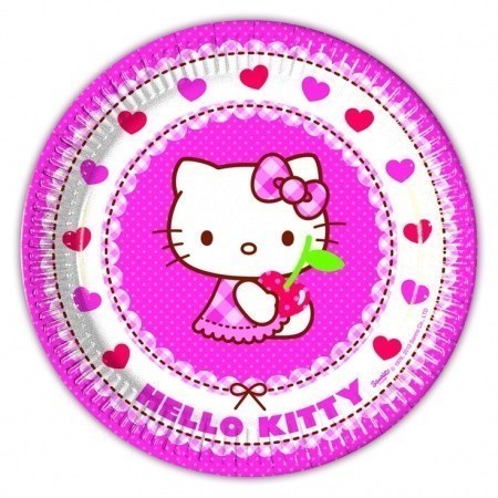 Conjunto de 8 pratos descartáveis para festas de aniversário com o tema Hello Kitty.